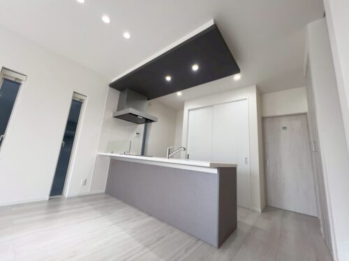 オープンキッチン上部は存在感ある下がり天井になっていますよ