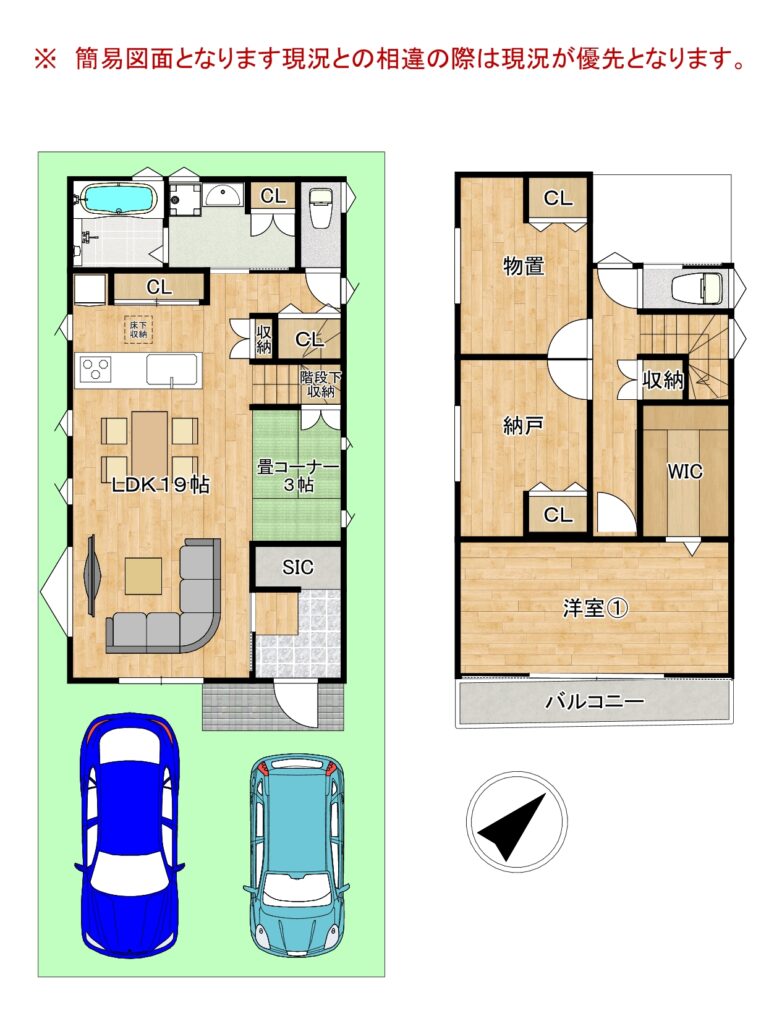 駐車スペースはゆとりの2台分を確保。前面道路は広々約4mあるため、車の出し入れもスムーズに行えます。